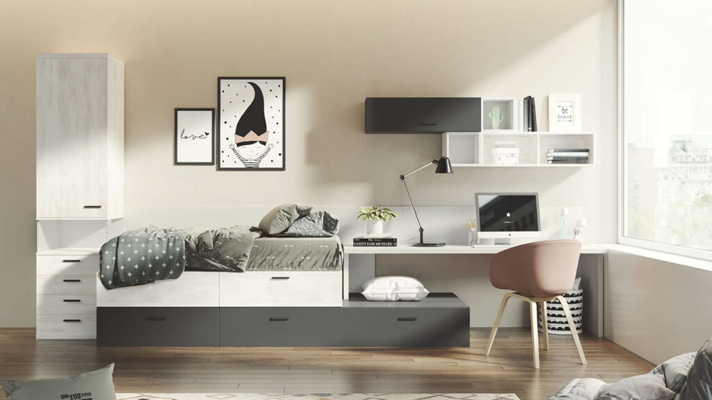 Alguna firmas de nuestras preferidas te ofrecen el mobiliario infantil a un precio realmente interesante y la posibilidad de configurar el dormitorio como desees, ya que se compone de piezas sueltas que puedes ir colocando tú mismo para personalizar tu espacio con mobiliario estándar. Hablamos de Kave Home Kids, Kenay Home Kids o Maison Du Monde. Además, existen numerosas casas de muebles a medida que configuran los dormitorios infantiles totalmente adaptados a las necesidades del cliente. Algunas de estas firmas son Garabatos, Quatro Muebles, La fábrica de sueños, Bainba, con precios muy ajustados, Muba Design, Ros, Mutesa o El Menut.